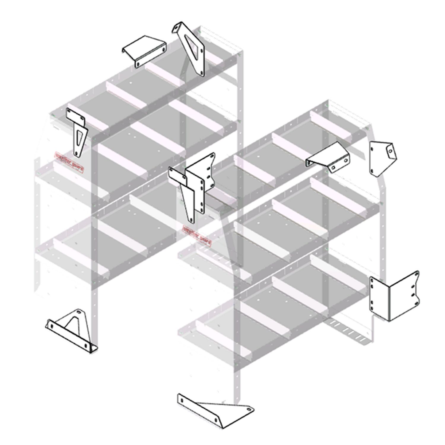 The Model 9751-3-01 Rear Installation Shelf Unit Mounting Kit uses existing reinforced seat belt or cargo tie down points or pre-existing holes provided by Ford in the Transit Connect for faster, easier and more secure shelving installation. No measuring or drilling required, no holes in the van floor.